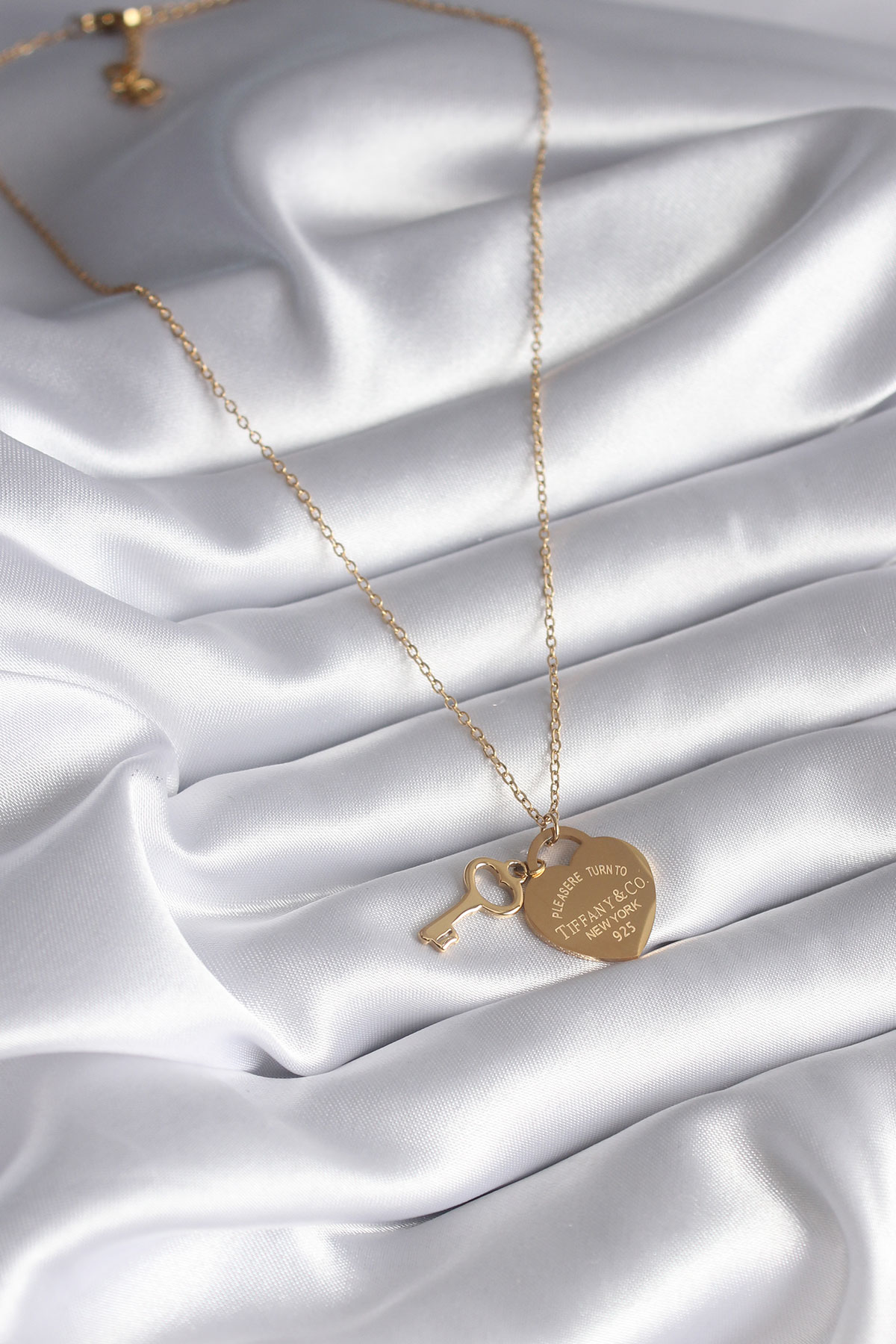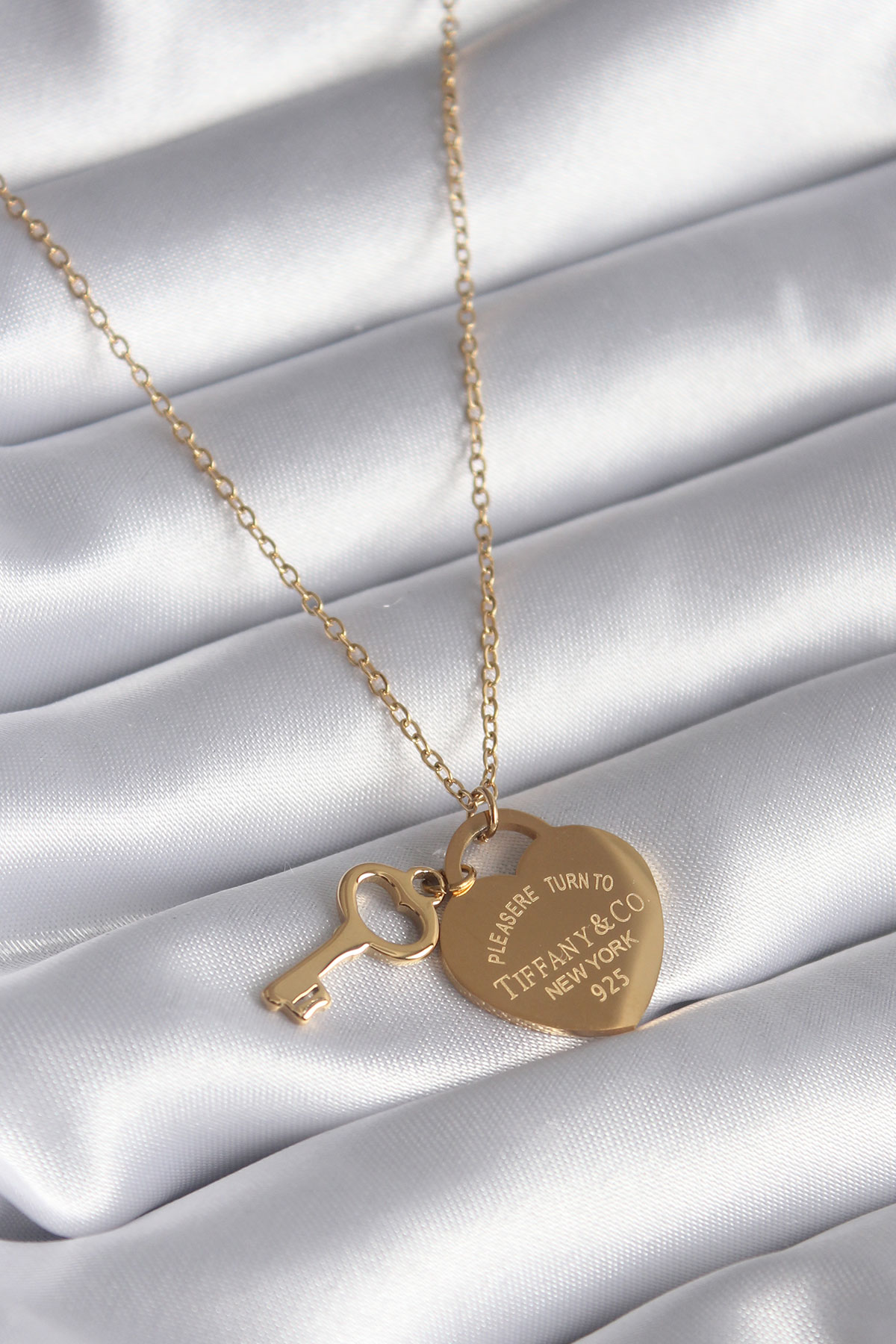 316L Çelik Gold Renk Kilit Kalp Anahtar Model Kadın Kolye
